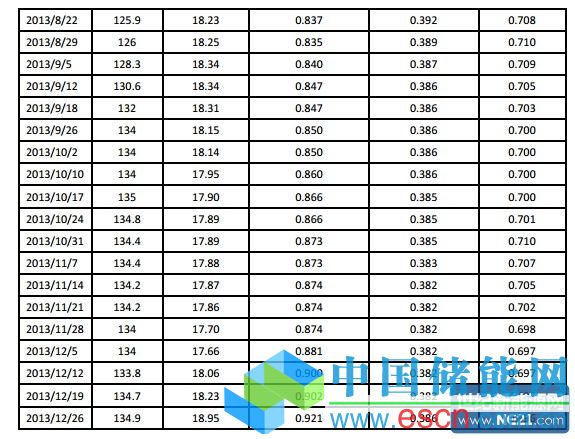 2013 年國(guó)際多晶硅現(xiàn)貨價(jià)格同國(guó)內(nèi)價(jià)格一致也呈先揚(yáng)后抑的走勢(shì),從年初15.35美元 /千克溫和增長(zhǎng)至 4 月初的 18.6 美元/千克,增幅為 21.2%。4 月中旬進(jìn)口價(jià)格逐漸走低, 于 6 月中旬下滑至 16.25 美元/千克,隨后微幅上漲至 16.63 美元/千克且兩個(gè)月內(nèi)維持不 變,之后進(jìn)口多晶硅價(jià)格在 18.1 美元/千克左右徘徊。受多晶硅價(jià)格影響,硅片價(jià)格也隨 之波動(dòng),其中,156mm多晶硅片周均價(jià)從年初 0.807 美元/片緩慢增長(zhǎng)至4 月中旬的 0.852 美元/片,增幅為 5.6%,4 月中旬 156mm 硅片價(jià)格開(kāi)始逐漸走低,降至 9 月初的 0.84 美 元/片,從9月中旬開(kāi)始硅片價(jià)格一路上漲至 12 月底的 0.921 美元/片;而受歐盟對(duì)華光伏 產(chǎn)品“雙反”影響,上半年電池片和組件的價(jià)格呈現(xiàn)上漲趨勢(shì),其中 156mm 多晶硅電池 片周均價(jià)從年初的 0.341 美元/瓦,增至6 月初的 0.414 美元/瓦,增幅為21.4%,隨后一路 下滑至 12 月底的 0.386 美元/瓦,降幅為 6.8%;晶硅組件周均價(jià)從 1 月初的 0.654 美元/ 瓦一路上漲至 6 月底的 0.733 美元/瓦,增幅為12.1%。但是 6 月份之后,國(guó)際市場(chǎng)特別是 歐盟地區(qū)需求開(kāi)始減弱,多晶硅電池片震蕩回落至 0.696 美元/瓦,但是跌幅為 5%(附表 1)