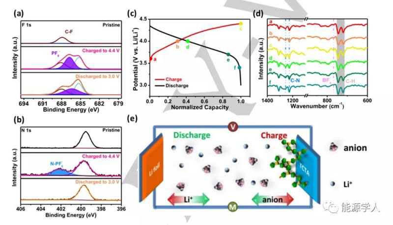 圖4. TCTA正極在不同充/放電狀態(tài)下的高分辨率XPS(a)F 1s和(b)N 1s光譜,(c)恒電流充/放電曲線,(d)相應的非原位FT-IR譜,(e)鋰-TCTA電池的電化學反應機理示意圖。