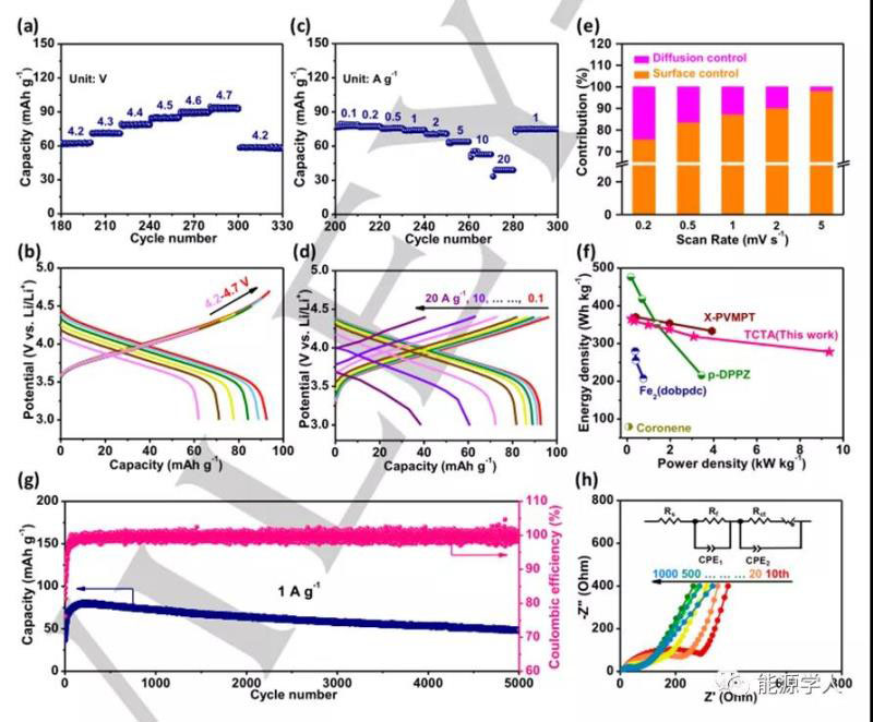 圖3.(a)分別在4.2至4.7 V的不同截止電壓下TCTA正極的循環(huán)性能和(b)相應充電/放電曲線。(c)不同電流密度下TCTA正極的倍率性能和(d)相應充電/放電曲線。(e)在不同掃速下擴散控制和表面控制的容量貢獻率,(f)文獻中報道的TCTA和其他有機正極材料的性能比較,(g)TCTA正極在1 A g-1下的長期循環(huán)性能,(h)在500 mA g-1時不同周期的TCTA正極的EIS譜(內(nèi)部:等效擬合電路)。