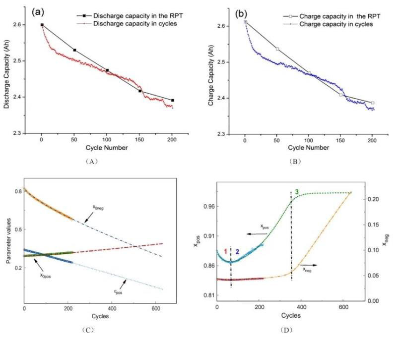 此三個階段在三元電池循環(huán)曲線上通常表現出宏觀容量衰減“快-慢-快”現象(圖11 A,B)。White等從單粒子(SP)模型的微觀電化學參數變化中亦給出相同證據:圖11(C)看出正極可利用活性材料比例隨循環(huán)始終下降;由圖11(D)可清晰看出老化的三個階段,1、2區(qū)域的轉折點(最低點)是LAMPE速度開始超過LLI的標志;而在區(qū)域3中,Li+在負極化學計量數快速增加,對應于Li+被滯留于負極中無法回到正極,同時正極材料損失仍在加深,二者共同作用使電池加速到達壽命終點。