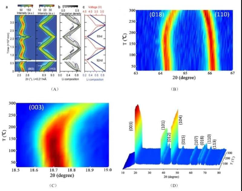 原位X射線衍射或中子衍射技術是監(jiān)測材料容量衰退過程中體相結構變化及失效過程的有效方法,近年來多維(時空、譜學、元素、襯度分辨)多尺度(微納米)X射線成像技術高速發(fā)展。從原理上看,其對應正極過程為: