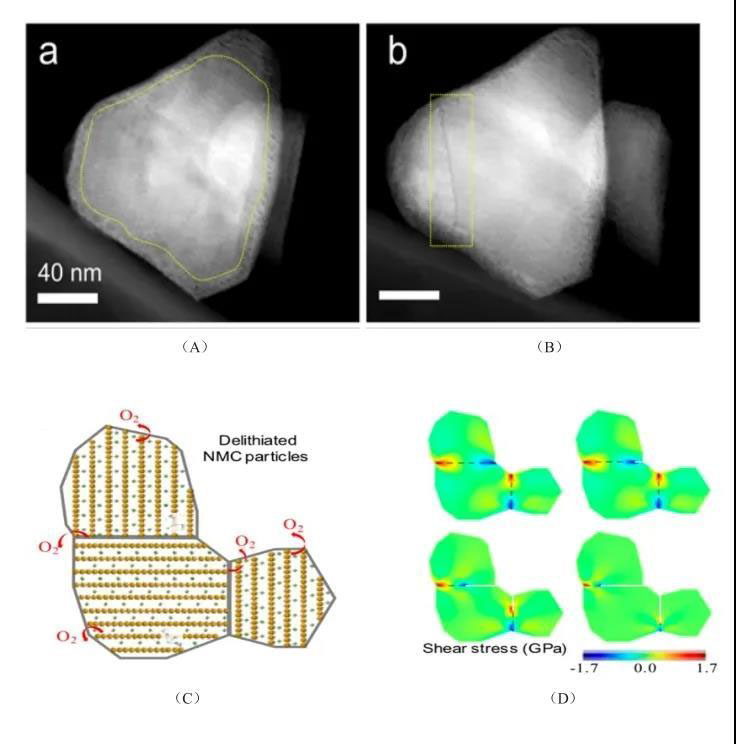 圖8 (A) 加熱前期NCM完整一次顆粒STEM結果;(B) 加熱后期由于失氧呈現裂紋(黃色方框內)NCM一次顆粒STEM結果;(C) 脫鋰態(tài)NCM表面晶格脫氧機理示意圖;(D)有限元法分析