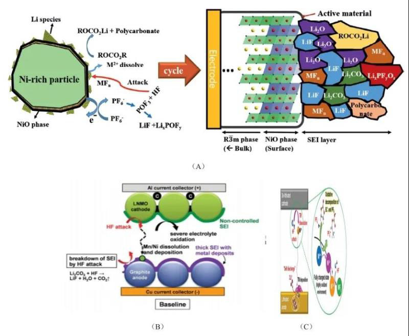 電極材料與電解液接觸的不穩(wěn)定性將引發(fā)多種界面非均相化學反應的發(fā)生。隨著鎳元素在材料中含量的升高,電極與電解液反應活性增強,會使得多種離子絕緣副產物,如LiF、LixCO3、LiOH等(取決于電解液成分)沉積于正極界面膜上,阻塞Li+擴散路徑,影響電化學性能(圖7 C) 。反應后的氧化物表面還原性增強,傾向于通過與體相原子重排的方式使表面結構進一步無序化,導致鋰離子體相傳荷阻抗進一步增加。痕量的水與LiPF6發(fā)生副反應所生成的HF與電極表面的過渡金屬離子反應,形成阻抗較大的產物如MnF2,造成功率損失(圖7 A, B) ,過渡金屬離子將會溶于電解液并隨充放電過程向負極遷移,并以金屬的形式沉積在負極表面,該行為必然會造成已嵌入的Li+被迫脫出進入電解液中,形成所謂的“自放電”過程,造成容量損失。Anderson等人對一批18650電池進行加速儲存壽命的測試結果證明,隨著儲存時間增加,正極材料表面CEI膜阻抗增大明顯,其主要成分包括聚碳酸酯、LiF、LixPFy型復合物和LixPFyOz型復合物等。