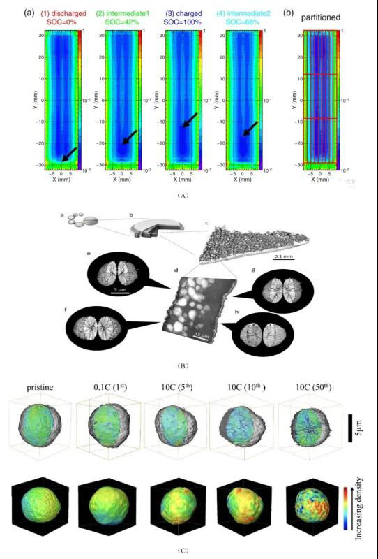 (2) 由于活性材料的接觸損失或鈍化反應將造成無法繼續(xù)容納Li+,通過分析不隨充放電過程產生位移的相的比率可宏觀上定量該失活部分。Kino等人借助波長為0.1-0.8nm的中子束對NCM電極Bragg edges進行轟擊,獲得原位中子衍射成像圖。該圖像能夠直觀反映商用18650圓柱電池在不同老化條件下各組分的分布情況(圖6A),通過電解液在一個電池充電循環(huán)過程的遷移及電極金屬Li的分布可以判斷電極反應的不均勻性。經過簡單的圖像網格化處理,可對晶體表面密度進行定量分析。Xia等人利用X射線nano/micro CT成像技術重現了LiNi0.6Co0.2Mn0.2O2(NCM 622)活性材料顆粒在不同快充協(xié)議下的介觀尺度微結構破壞,由此認為,在大電流充電情況下,電解液向顆粒微裂紋內部滲透程度增加,使載流子擴散路徑受阻,導致二次顆粒內局部電子電導與離子電導不匹配,造成局部SOC不均勻,加速了機械應力累積及裂紋的持續(xù)生長。通過多圈循環(huán)后的NCM電極斷層成像分析(圖6 B(a-c)),可觀察到尺寸各異的顆粒隨機團聚現象;再隨機選取其子區(qū)域進行納米分辨率成像(圖6 B(d)),可觀察到單顆粒明顯的機械不完整性(圖6 B(e-h))。為了同時將倍率與循環(huán)圈數對載流子傳輸路徑的影響修正引入模型,作者借助三維重構算法重現了體素圖像(圖6 C),能夠直觀反映出電池體相結構破壞程度。