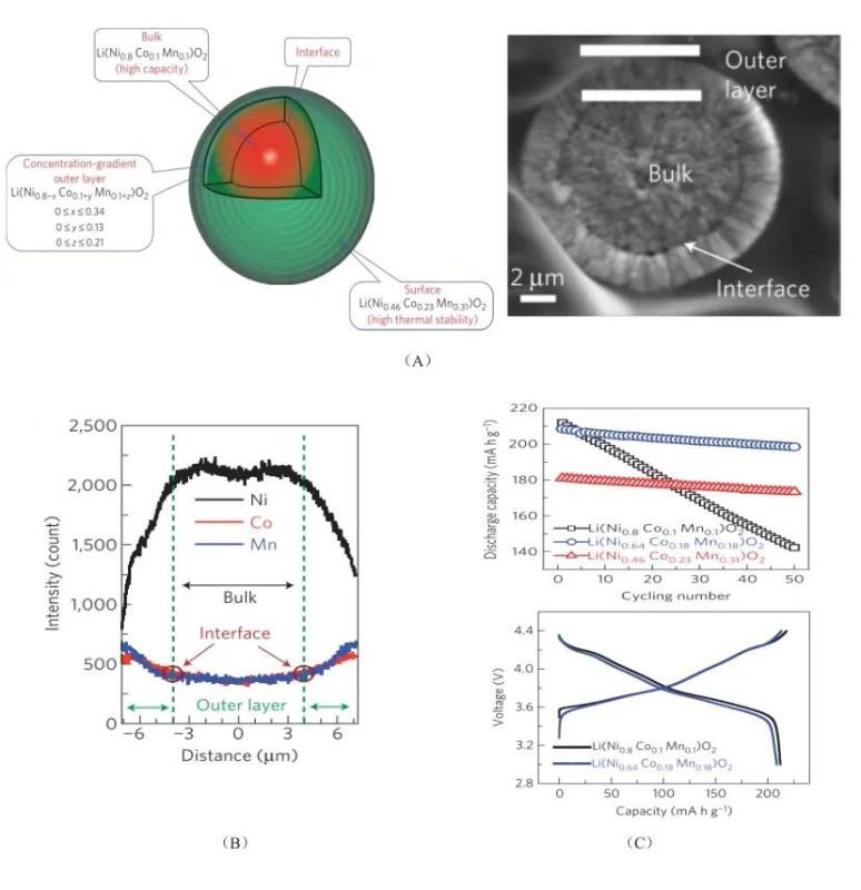 除了直接的元素摻雜外,設計濃度梯度材料也是一種既能維持材料結構穩(wěn)定性和熱穩(wěn)定性又不犧牲電化學性能的方法。Yang-Kook Sun等人合成了一種內部富Ni外層富Mn的梯度材料,從活性材料顆粒本體中心向外層,其Ni濃度呈梯度降低,而Mn和Co濃度呈梯度增加(圖5(A、B))。其中Ni位于核內,提供高容量、保證電化學性能;Mn位于殼上,維持結構穩(wěn)定性和熱穩(wěn)定性(圖5(C))。具有該結構的三元正極材料能夠滿足PHEV中能量密度需求。