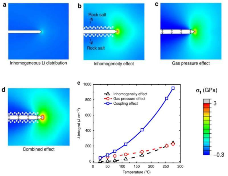 圖4 對NCM622材料裂紋擴展驅動力的多物理場耦合有限元模擬結果。(a)僅考慮Li+體相濃度分布不均應力分布情況;(b)275℃條件下考慮同時考慮Li+濃度分布不均和層狀-巖鹽相相變對應力分布的影響;(c) 275℃條件下考慮由氧氣釋放帶來的界面壓力對應力分布的影響;(d)當(b)、(c)所示情況同時存在時的應力