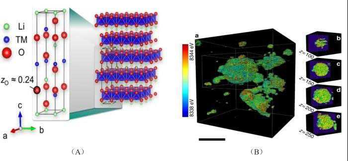 圖3 (A)層狀LiNixCoyMnzO2材料單個晶胞晶體結構示意[18]; (B) (a) 231℃加熱20.5h后單個NCM二次顆粒中等價態(tài)Ni (反應面)三維分布圖; (b-e) 單個像素體元Ni價態(tài)隨不同深度分布情況