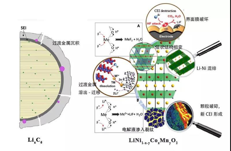鎳鈷錳三元層狀氧化物(NCM)正極材料由于其優(yōu)越的綜合性能在動力/儲能電池系統(tǒng)(ESS)領域得到廣泛應用。雖然Ni含量的增加可提高三元材料的比容量及電池的能量密度,但相關電池體系的容量保持率和安全性將會變差。如何有效解決該矛盾是此類NCM電池所面臨的的關鍵問題。本文從NCM電池體系循環(huán)過程中常見的體相結構破壞和正極-電解液界面組成改變兩方面失效現象出發(fā),結合近年來國內外對NCM失效模式研究中所提出的新理論、方法、應用,從機械破壞、結構演變、電化學極化、化學副反應、正負極協(xié)同效應等多個角度對NCM材料的衰退機理提出見解,對指導電池用戶合理制定充放電協(xié)議、緩解電動汽車(EV)里程焦慮乃至材料設計本身均有重要的指導及借鑒意義。