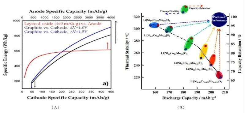 圖1 (A) 僅對正極比容量(黑色曲線)、負極比容量(紅色曲線)優(yōu)化并在此基礎上提高工作電壓(藍色曲線)后全電池能量密度變化情況示意圖 (B) 不同Ni、Co、Mn元素含量三元層狀正極材料放電容量、熱穩(wěn)定性、容量保持率綜合比較