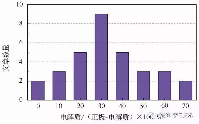圖3軟包電芯中,正極孔隙率為27%,負(fù)極孔隙率為31%,隔膜孔隙率為40%。正極中,液態(tài)電解質(zhì)占滿了所有孔隙,液態(tài)電解質(zhì)與正極活性物質(zhì)加液態(tài)電解質(zhì)的總質(zhì)量比為7.8%。在2017年發(fā)表的全固態(tài)電解質(zhì)電池的文章中,固態(tài)電解質(zhì)材料與固態(tài)電解質(zhì)加正極活性物質(zhì)總質(zhì)量的比例的文章數(shù)見圖5,可見多數(shù)研究中固體電解質(zhì)的質(zhì)量占比高于10%。這是由于固態(tài)電解質(zhì)材料多以粉體顆?;虮∧さ男问酱嬖谟谡龢O中,而且具備不可壓縮性,固態(tài)電解質(zhì)實際上會在正極中占據(jù)更多的體積,這樣會進(jìn)一步降低全固態(tài)鋰電池電芯的質(zhì)量及體積能量密度。