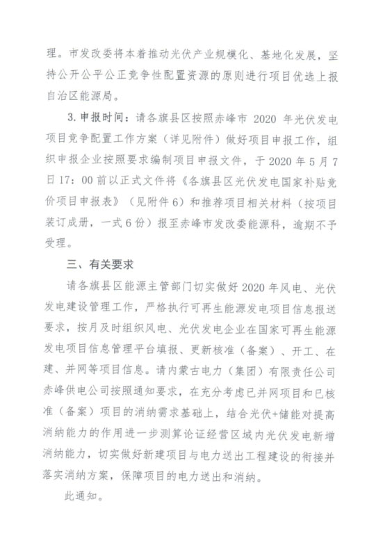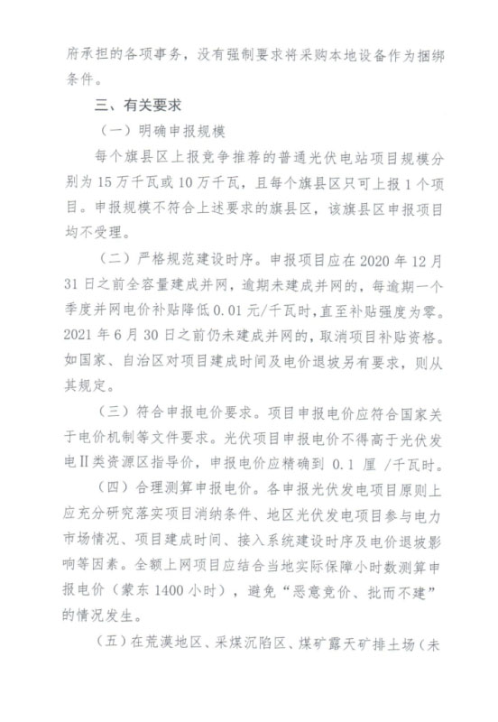 布局原則支持在荒漠地區(qū)、采煤沉陷區(qū)、煤礦露天礦排土場建設(shè)光伏電站,優(yōu)先支持光伏+儲能項目建設(shè)。每個旗縣區(qū)申報1各項目,規(guī)模分別為15萬千瓦或10萬千瓦。申報企業(yè)按照要求編制項目申報文件,于2020年5月7日17:00前報至赤峰市發(fā)改委能源科,逾期不予受理。