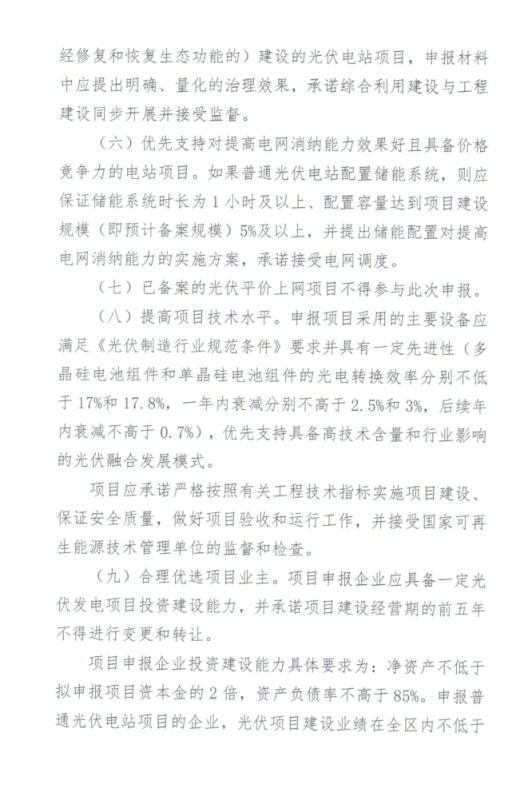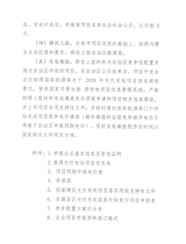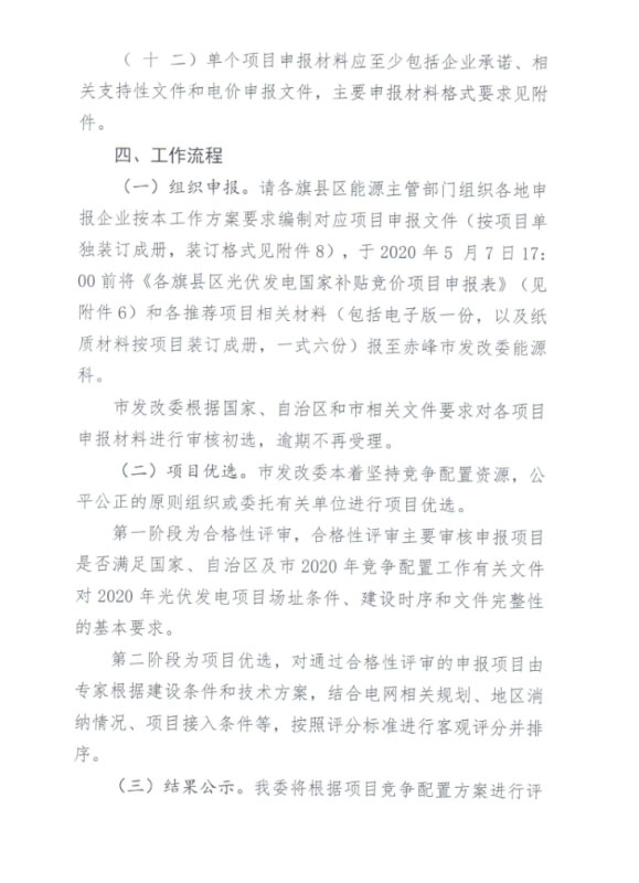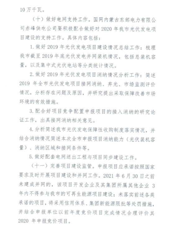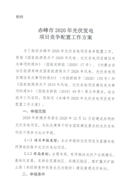 值得注意的是,根據(jù)《赤峰市2020年光伏發(fā)電項目競爭配置工作方案》,申報范圍為2020年新建并承諾在2020年12月31日前建成并網(wǎng)的光伏發(fā)電項目。項目類型為直接向電網(wǎng)饋電的集中式光伏電站項目。申報普通光伏電站項目的企業(yè),光伏項目建設(shè)業(yè)績在全區(qū)內(nèi)不低于10萬千瓦。