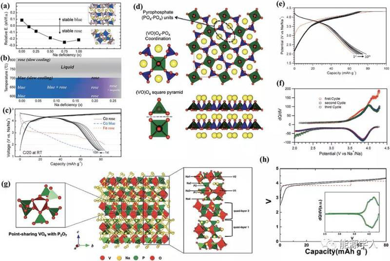 焦磷酸鹽Na2MP2O7(M= Fe,Mn,Co)由于良好的結(jié)構(gòu)穩(wěn)定性,熱穩(wěn)定性和快的鈉離子流動性而被廣泛關(guān)注。它們的結(jié)構(gòu)多樣,主要分為:三斜相,四方相和單斜相。一般情況下,Na2FeP2O7和Na2MnP2O7的熱穩(wěn)定相為三斜相,三斜相的Na2MnP2O7可逆容量為80-90 mA h g-1,電壓平臺約在3.7 V。三斜相的Na2FeP2O7可逆容量約為90 mA h g-1,電壓平臺在3.0 V左右。因此Na2MnP2O7和Na2FeP2O7的能量密度較低,這嚴重限制了它們的進一步應用。Na2CoP2O7的熱力學穩(wěn)定相為正交相,另外它的晶相與合成的條件(鈉含量,煅燒溫度等)有關(guān),正交晶相的Na2CoP2O7(blue相)平均放電電壓僅有3.0 V。而三斜相的Na2CoP2O7(rose相)工作電壓較高(約為4 V)。圖4展示了Na2CoP2O7的晶相與合成條件之間的關(guān)系以及rose相的電化學性能。除此之外,Na2(VO)P2O7、Na7V3(P2O7)4等化合物也得到了廣泛研究。目前焦磷酸鹽類正極材料一個主要問題是較大的分子量導致它們的可逆比容量很低,難以實際應用。