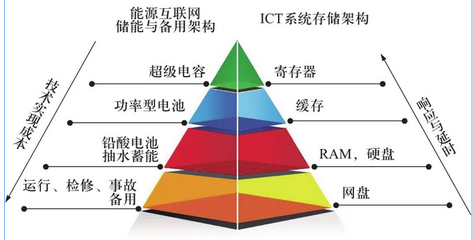 在能源互聯(lián)網(wǎng)中,不同性質(zhì)的能量存儲(chǔ)介質(zhì)適用于不同儲(chǔ)能應(yīng)用需求?;谀芰啃畔⒒夹g(shù),可以針對(duì)不同儲(chǔ)能應(yīng)用需求,將多種物理化學(xué)性質(zhì)迥異的儲(chǔ)能介質(zhì)進(jìn)行數(shù)字化混用,實(shí)現(xiàn)一套物理儲(chǔ)能系統(tǒng)同時(shí)滿足多種儲(chǔ)能應(yīng)用需求,實(shí)現(xiàn)儲(chǔ)能系統(tǒng)的價(jià)值最大化。值得指出的是,軟件定義數(shù)字復(fù)合儲(chǔ)能系統(tǒng)可以從根本上解耦電池系統(tǒng)應(yīng)用需求與電池單體物理化學(xué)特性,在系統(tǒng)應(yīng)用層面上打破對(duì)當(dāng)前電池應(yīng)用依賴于電池單體能量密度和功率密度的迷思。為了方便讀者理解這個(gè)概念,圖4表述軟件定義數(shù)字復(fù)合儲(chǔ)能與信息存儲(chǔ)體系的對(duì)照邏輯關(guān)系。
