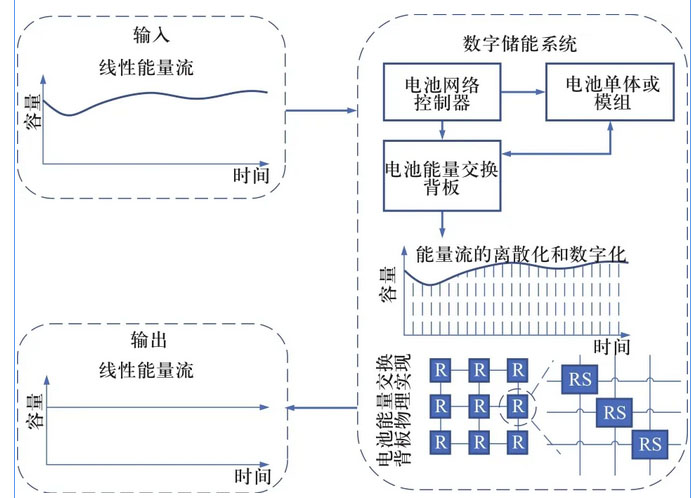 在數(shù)字化電池能量交換系統(tǒng)中,模擬能量流被以網(wǎng)絡(luò)化連接的高頻MOSFET電力電子開(kāi)關(guān)離散化成為時(shí)間序列上的“能量片”(energy slice),離散化后的“能量片”上附加其他信息數(shù)據(jù),如電池資產(chǎn)的所有者、電池電荷狀態(tài)、電池健康狀態(tài)等信息。通過(guò)采用程序控制的電池網(wǎng)絡(luò)控制器對(duì)來(lái)自不同電芯的“能量片”進(jìn)行重組和優(yōu)化,去除電池能量產(chǎn)生和使用過(guò)程中的不確定性和非線性,徹底屏蔽了電池物理和化學(xué)上的差異性,克服短板效應(yīng),進(jìn)而提升了電池儲(chǔ)能系統(tǒng)性能,可重構(gòu)電池網(wǎng)絡(luò)對(duì)電池管理技術(shù)的范式創(chuàng)新原理圖如圖1所示。
