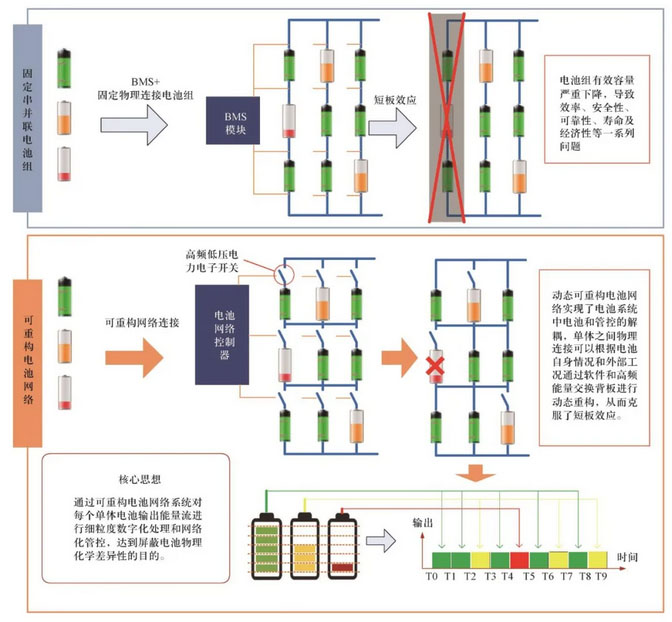 ? 圖1 可重構(gòu)電池網(wǎng)絡(luò)對(duì)當(dāng)前電池管理技術(shù)的范式創(chuàng)新原理圖