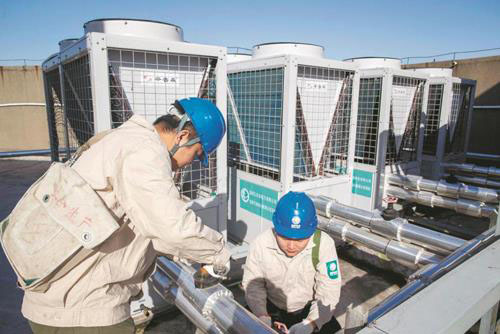 工作人員在江蘇靖江國(guó)際大酒店頂層檢查氣能循環(huán)泵進(jìn)出水閥門運(yùn)行情況。