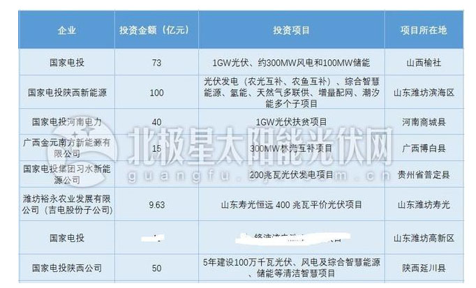 具體來(lái)看,國(guó)家電投將投資73億元,在山西榆社建設(shè)1GW光伏,300MW風(fēng)電及100MW儲(chǔ)能項(xiàng)目;在廣西博白投資15億元建設(shè)300MW林光互補(bǔ)項(xiàng)目;在河南商城縣投資40億元建設(shè)1GW光伏扶貧電站,在貴州普定建設(shè)200MW光伏項(xiàng)目。