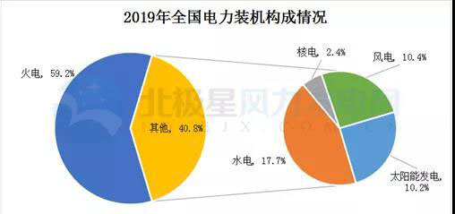 電源結構繼續(xù)得到優(yōu)化,風電等可再生能源比例逐步增加。2018年,火電裝機容量114367萬千瓦,占比60.2%;并網(wǎng)風電裝機容量18426萬千瓦(增長12.4%),占比9.69%。2019年火電裝機119055萬千瓦,占比59.2%,同比下降一個百分點;并網(wǎng)風電裝機容量21005萬千瓦(同比增長12.27%),占比突破10.45%,增加近一個百分點。