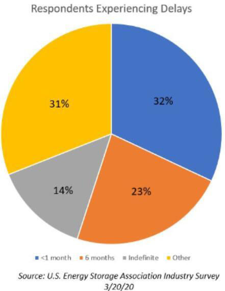 美國在三月份對儲能協(xié)會175名成員進(jìn)行的民意調(diào)查結(jié)果顯示,有62%的受訪者表示正遭遇儲能項目被延誤,44%的人認(rèn)為會受到一個月的短期影響,而37%預(yù)計延誤將持續(xù)六個月或更長時間,還有一部分人則無法預(yù)估項目到底會停滯多久。