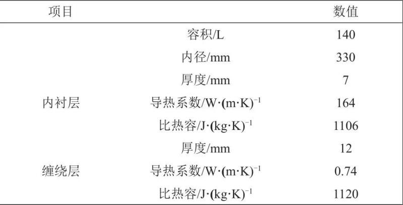 國(guó)內(nèi)典型III型儲(chǔ)氫瓶的結(jié)構(gòu)參數(shù)如表1所示,仿真結(jié)果表明,加氫結(jié)束后儲(chǔ)氫瓶?jī)?nèi)氫氣溫度為73.5 ℃,溫升48.5 ℃。氫氣加注過(guò)程中儲(chǔ)氫瓶?jī)?nèi)氫氣溫度逐漸升高,向儲(chǔ)氫瓶壁面散熱,首先與內(nèi)壁發(fā)生傳熱使得鋁內(nèi)膽內(nèi)襯溫度升高,然后內(nèi)襯層將熱量傳導(dǎo)至纏繞層,最后經(jīng)外壁面散熱至環(huán)境。在氫氣加注的280 s時(shí)間內(nèi),儲(chǔ)氫瓶?jī)?nèi)氫氣對(duì)壁面的總散熱量為2317 kJ,其中鋁內(nèi)膽內(nèi)襯吸收熱量1319 kJ,碳纖維纏繞層吸收熱量956 kJ,經(jīng)儲(chǔ)氫瓶壁面向環(huán)境散熱量42 kJ,這說(shuō)明加氫過(guò)程中瓶?jī)?nèi)氫氣的換熱量有98%被儲(chǔ)氫瓶體吸收,僅有2%熱量散出儲(chǔ)氫瓶,因此,儲(chǔ)氫瓶壁面的導(dǎo)熱特性對(duì)加氫溫升有直接影響。