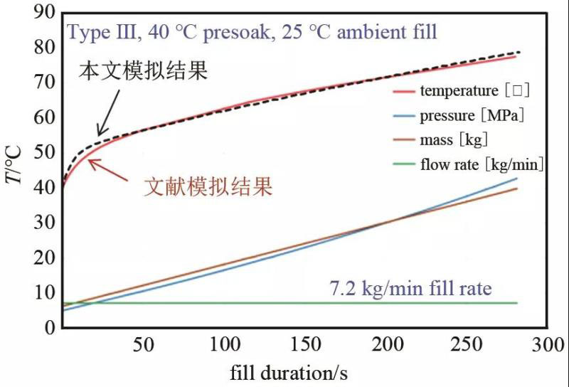 根據(jù)美國(guó)能源部公布的III型瓶加氫結(jié)果[6],采用相同的儲(chǔ)罐參數(shù)和加注條件,模擬獲得的氫氣溫升曲線與文獻(xiàn)報(bào)道值基本重合(圖2),說(shuō)明建立的仿真模型具有可靠性。