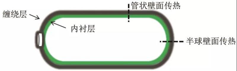 為獲得加氫過(guò)程中瓶?jī)?nèi)氫氣溫度的變化,還需要求解出瓶?jī)?nèi)氫氣的散熱量。假設(shè)儲(chǔ)氫瓶是兩端半球、中間管狀的結(jié)構(gòu),氫氣經(jīng)壁面對(duì)外散熱時(shí),瓶壁只存在徑向的溫度梯度。瓶壁包括內(nèi)襯和纏繞兩層,如圖1所示。