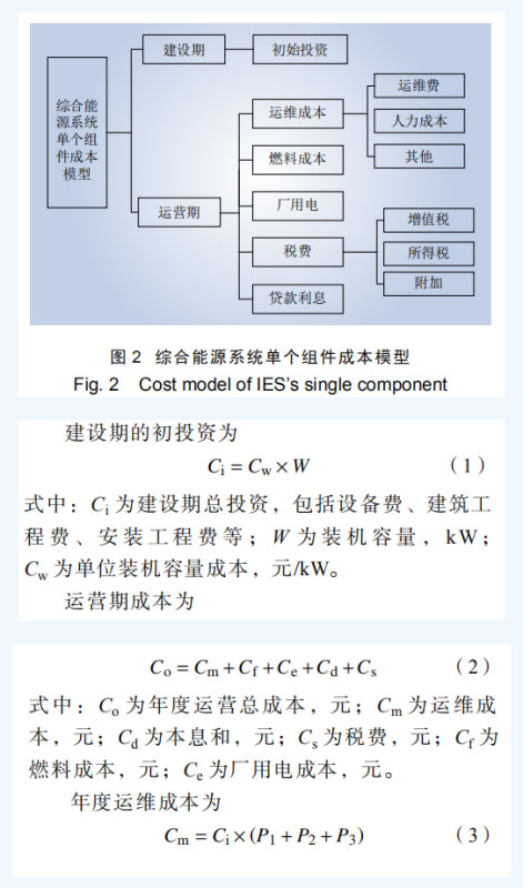 2.1 綜合能源系統(tǒng)單個組件成本模型 綜合能源系統(tǒng)單個組件成本包括建設(shè)期的初始投資,運(yùn)營期的運(yùn)維成本(運(yùn)維費(fèi)、人力成本 等)、燃料成本(對于分布式天然氣、生物質(zhì)有 此成本,光伏、風(fēng)電沒有)、廠用電損耗、貸款 利息、稅費(fèi)等,單個組件成本模型如圖 2 所示。