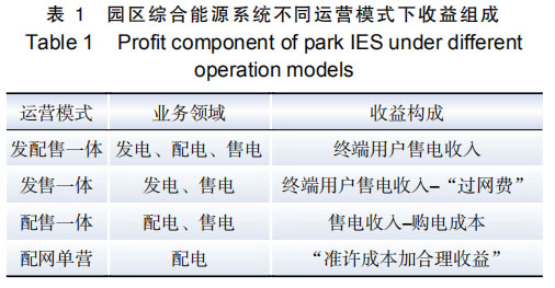 不同運(yùn)營模式下投資主體能整合資源不同, 所經(jīng)營業(yè)務(wù)領(lǐng)域也不同,所以收益組成也不相同。比如對于配網(wǎng)單營模式,擁有的是配網(wǎng)資源,從事的是配電業(yè)務(wù),通過“準(zhǔn)許成本加合理收益”獲取收益;對于發(fā)售一體化模式,擁有的是分布式發(fā)電資源和用戶負(fù)荷資源,收益為用戶售電收入與“過網(wǎng)費(fèi)”之差。對于同時涉及多種業(yè)務(wù),收益是多種業(yè)務(wù)收益的疊加。表 1 展示了 園區(qū)綜合能源系統(tǒng)不同運(yùn)營模式下收益構(gòu)成。