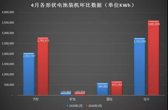 GGII統(tǒng)計(jì)數(shù)據(jù)顯示,4月方形、軟包和圓柱電池裝機(jī)電量環(huán)比都呈現(xiàn)增長(zhǎng)態(tài)勢(shì)。