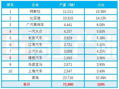 1、特斯拉產(chǎn)量奪冠 專用車裝機(jī)環(huán)比增長(zhǎng)155%