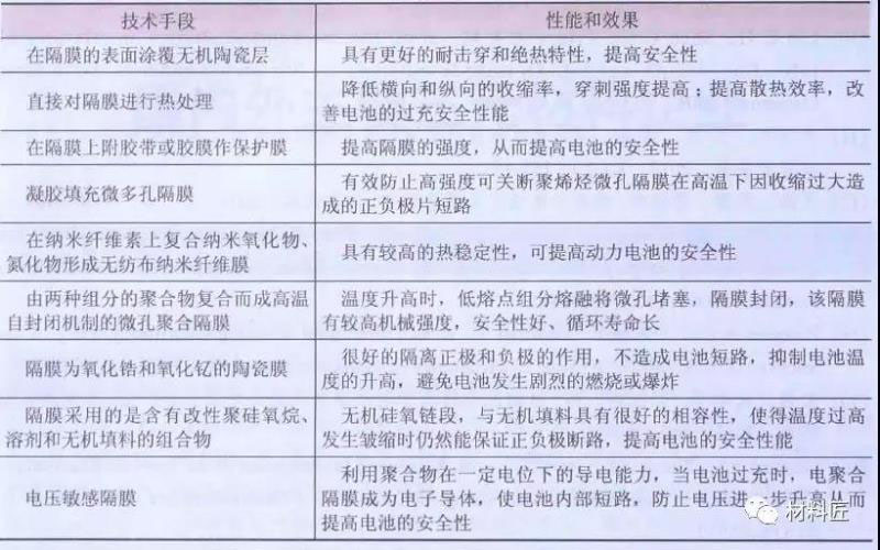 隔膜垂直方向上的機(jī)械強(qiáng)度越高,電池發(fā)生微短路的概率就越?。桓裟さ臒崾湛s率越小,電池的安全性能越好。隔膜的微孔關(guān)閉功能也是改進(jìn)動(dòng)力電池安全性的另一方法;凝膠類聚合物電解質(zhì)具有較好的保液性,采用這種電解質(zhì)的電池比常規(guī)液態(tài)電池具有更好的安全性;除此,陶瓷隔膜也可以改進(jìn)電池的安全性。常見的國(guó)內(nèi)專利文獻(xiàn)對(duì)鋰電池隔膜的制備和處理類型,見下表。