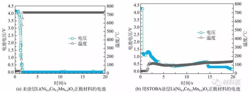 上圖采用一種納米級(jí)樹枝狀結(jié)構(gòu)的高分子化合物(STOBA)對(duì)NCM(424)進(jìn)行涂層,當(dāng)鋰電池發(fā)生異常,產(chǎn)生高溫時(shí),會(huì)形成一道薄膜阻隔鋰離子間的流動(dòng),穩(wěn)定鋰電池,借以提高電池安全度。由下圖可見,針刺實(shí)驗(yàn)時(shí),正極材料未涂STOBA涂層的電池內(nèi)部溫度在幾秒鐘內(nèi)升至700℃,而用STOBA涂層正極材料的電池溫度最高只有150℃。