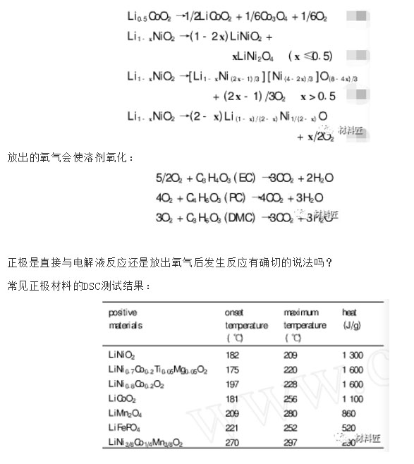 常見的正極材料在溫度低于650℃時(shí)是穩(wěn)定的,在充電時(shí)處于亞穩(wěn)定狀態(tài),溫度升高時(shí)發(fā)生如下反應(yīng)。