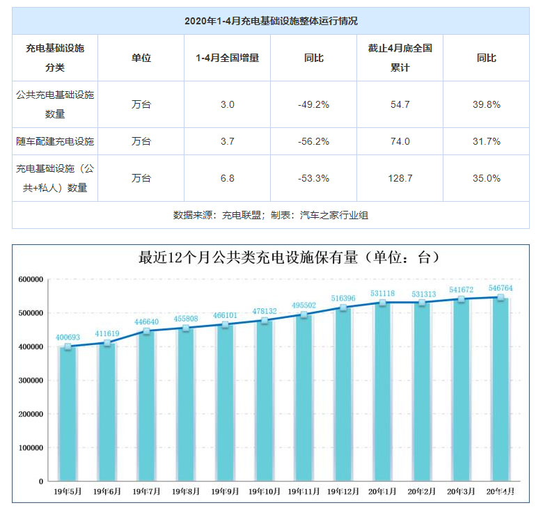 5月11日,中國電動汽車充電基礎(chǔ)設(shè)施促進聯(lián)盟(簡稱“充電聯(lián)盟”)發(fā)布了2020年4月電動汽車充換電基礎(chǔ)設(shè)施的運行情況。截至4月底,我國全國充電基礎(chǔ)設(shè)施累計數(shù)量為128.7萬臺,同比增加35%。其中,公共類充電設(shè)施保有量達到54.7萬臺,較上月增加約5000臺,同比增長39.8%。受新冠疫情影響,充電樁新增投建數(shù)量維持低增長,4月增量低于通常水平。