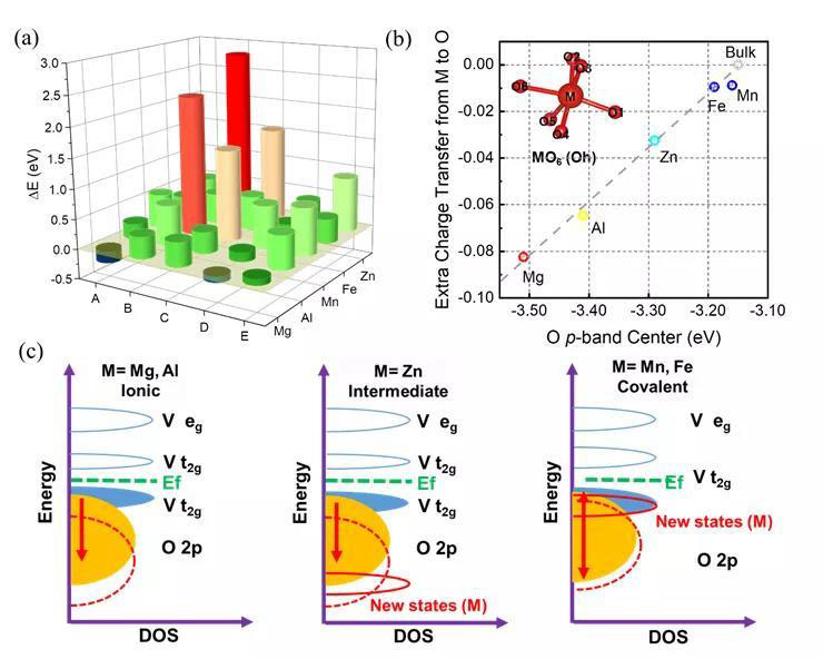 對兩種摻雜位點(diǎn)下結(jié)構(gòu)的電子結(jié)構(gòu)進(jìn)行第一性原理計(jì)算,并引入氧的p帶中心作為材料在鋰離子脫嵌過程穩(wěn)定性的判斷標(biāo)準(zhǔn)。研究表明,Mg摻雜對電子導(dǎo)電性的影響較小,而V位摻雜會一定程度改善鋰離子遷移速率,并且造成氧的p帶中心負(fù)移,保證了高電位下過渡金屬氧化還原的穩(wěn)定性。隨后,我們將這種那個Mg摻雜行為的規(guī)律推廣到其他常見的金屬離子,如Al、Mn、Fe和Zn,并詳細(xì)討論了摻雜體系電子、離子的輸運(yùn)行為、結(jié)構(gòu)穩(wěn)定性的判斷依據(jù)等,為后續(xù)相似工作的開展提供了參考。