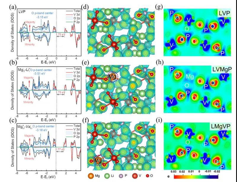 對于聚陰離子型的磷酸釩鋰材料,除Mg可以取代Li與V位,其他離子如Al、Mn、Fe、Zn在能量上更傾向于V位的取代,并且摻雜引起的體系中的電荷非平衡更傾向于通過空位/間隙Li引入而不是極化子形成來得到補(bǔ)償。聚陰離子型磷酸釩鋰的電子導(dǎo)電機(jī)制主要為極化子遷移,常見的陽離子摻雜由于對極化子濃度影響很小,因而幾乎不能提高其電子導(dǎo)電性。另外,磷酸釩鋰中引入的間隙Li+離子可以作為過渡態(tài),進(jìn)一步增強(qiáng)鋰離子傳輸速率。氧的p帶中心可以用來描述磷酸釩鋰摻雜體系的穩(wěn)定性,其遠(yuǎn)離費(fèi)米能級的負(fù)偏移被認(rèn)為可以抑制氧在高電位下參與電荷轉(zhuǎn)移,進(jìn)而增加磷酸釩鋰的多電子氧化還原穩(wěn)定性。