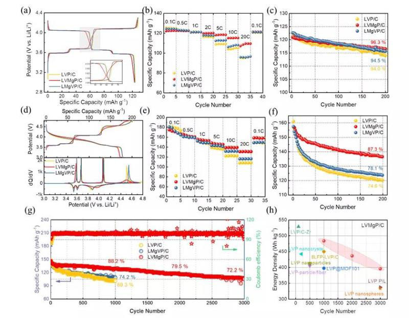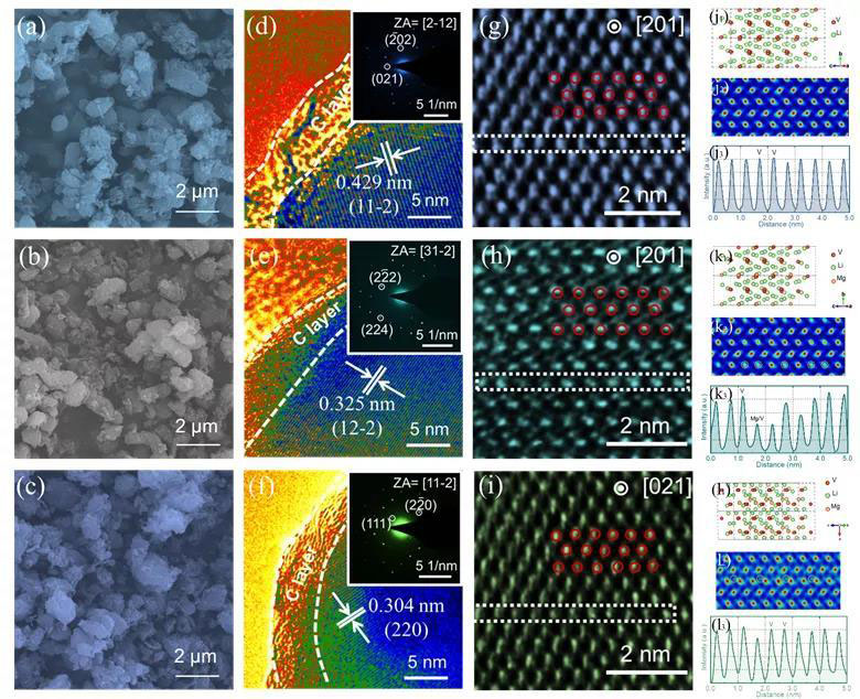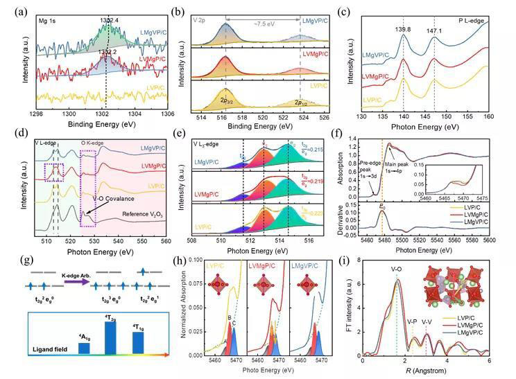 通過采用包括XPS、XAS在內(nèi)的光譜學(xué)手段和SEM、TEM在內(nèi)的電子顯微學(xué)手段,對不同位點(diǎn)Mg摻雜磷酸釩鋰的結(jié)構(gòu)進(jìn)行了深入分析。結(jié)果表明,V位摻雜會造成V-O多面體對稱性增強(qiáng),晶胞體積具有擴(kuò)大的趨勢,而Li位摻雜對本體結(jié)構(gòu)的影響較小。