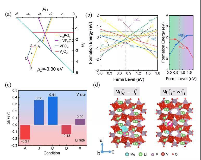 在磷酸釩鋰本征缺陷的研究的基礎(chǔ)上,進(jìn)一步預(yù)測了不同金屬離子的摻雜行為,包括其摻雜位點(diǎn)及其對應(yīng)缺陷形成能、電荷補(bǔ)償機(jī)制。特別地,對于Mg摻雜的情況,Li、V為摻雜在能量上均是可行的,而為了保持電荷平衡,體系通過引入額外的原子(空位)來抵消摻雜劑的等效電荷,而不是極化子的形成。這樣的結(jié)果從理論上表明,可以通過控制合成過程中Li,V和Mg的相對豐度來調(diào)整Mg的晶格位點(diǎn)偏好。