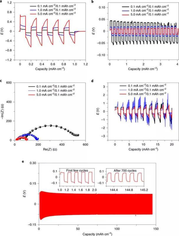 為了驗(yàn)證該假設(shè),作者基于含50 mol%NaFSI鹽的C3mpyrFSI離子液體體系的Na對(duì)稱(chēng)電池,在50℃下進(jìn)行長(zhǎng)電化學(xué)循環(huán)之前,采用了不同的負(fù)極極化作為預(yù)處理。通過(guò)在三個(gè)樣品上施加0.1、1.0和5.0 mA cm?2三種不同的電流密度(每步0.1 mAh cm?2)進(jìn)行5個(gè)短周期(圖4a),實(shí)現(xiàn)了不同的電極極化;電流密度越大,極化電位越高。預(yù)處理后的每個(gè)樣品在電流密度為0.1和1.0 mA cm?2的情況下進(jìn)一步循環(huán)20個(gè)周期,然后在5.0 mA cm?2的情況下各循環(huán)10個(gè)周期。圖4b,d和補(bǔ)充圖6給出了這些長(zhǎng)循環(huán)的計(jì)時(shí)電位曲線。最后證明了在電流密度為5.0 mA cm-2的條件下預(yù)處理的樣品具有超過(guò)700個(gè)循環(huán)的長(zhǎng)循環(huán)穩(wěn)定性(圖4e)。顯然,在5.0 mA cm?2的預(yù)處理?xiàng)l件下,初始極化電位最大,沉積時(shí)間最短(對(duì)于等量電荷);但是,對(duì)于隨后在0.1 mA cm-2和1.0 mA cm-2處的循環(huán),此電池在三個(gè)電池中顯示出最小的過(guò)電勢(shì)。在0.1 mA cm?2處經(jīng)過(guò)20個(gè)循環(huán)后獲得的電化學(xué)阻抗譜證實(shí)了在5.0 mA cm-2的條件下進(jìn)行預(yù)處理的電池形成了一個(gè)較低的Rct表面(圖4c)。在1.0 mA cm-2和5.0 mA cm-2的條件下進(jìn)一步循環(huán)還表明,在高電流密度下的預(yù)處理有利于對(duì)稱(chēng)電池在更高速率下的循環(huán)行為,而另外兩個(gè)在0.1 mA cm?2和1.0 mA cm?2的較低電流下進(jìn)行預(yù)處理的電池,要么由于短路而失效,要么表現(xiàn)出不穩(wěn)定的電壓分布。值得注意的是,我們觀察到較高的電流密度預(yù)處理步驟可在1.0 mA cm-2 / 0.1 mAh cm-2的條件下實(shí)現(xiàn)非常穩(wěn)定的長(zhǎng)期恒電流循環(huán)(圖4e顯示700多個(gè)循環(huán)而沒(méi)有故障跡象),表明在這些條件下Na SEI的穩(wěn)定性。