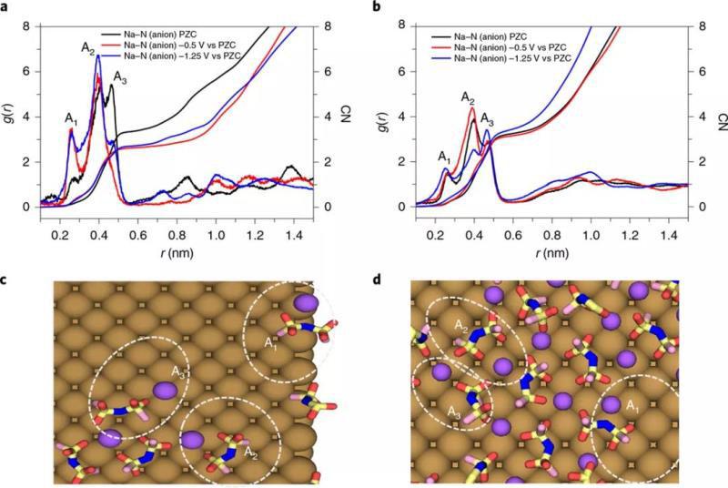 圖3最內(nèi)電解質(zhì)層 Na-FSI配位。在10-mol% (a)和50 mol% (b)鹽體系下,Na-NFSI在電極表面0.61 nm內(nèi)最內(nèi)層配位的RDFs, g(r),以及配位數(shù)分布曲線。兩張快照顯示了在10-mol% (c)和50 mol% (d)鹽體系中,-1.25 V下(相對(duì)于PZC)最內(nèi)層中典型Nax(FSI)y配合物與10-mol%(c)和50-mol% (d)鹽體系中的PZC的對(duì)比。三種類(lèi)型的Na-FSI配位,即A1、A2和A3在圖中有標(biāo)注。