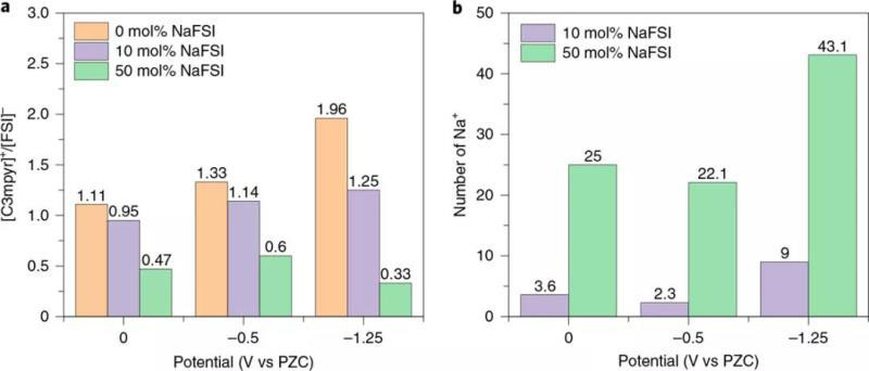 圖2 最內(nèi)界面層中不同離子數(shù)量的分析。在不同電位(PZC,-0.5V,-1.25V)和不同鹽濃度C3mpyrFSI體系(0、10和50 mol%)中[C3mpyr] +與[FSI]-的比率a)與Na +的數(shù)目b)。