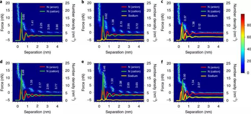 圖1 AFM力測(cè)試與MD模擬獲得的離子液體中界面分層結(jié)構(gòu)。含不同濃度NaFSI(a, d:0mol% , b, e:10mol%, c,f:50mol%)的C3mpyrFSI離子液體在OCP(AFM)和PZC(MD)電位下的AFM力-距離曲線(顏色條在右側(cè))與MD計(jì)算得到的離子數(shù)密度曲線(紅色:[FSI]-,綠色:[C3mpyr]+ ,黃色:Na+ )