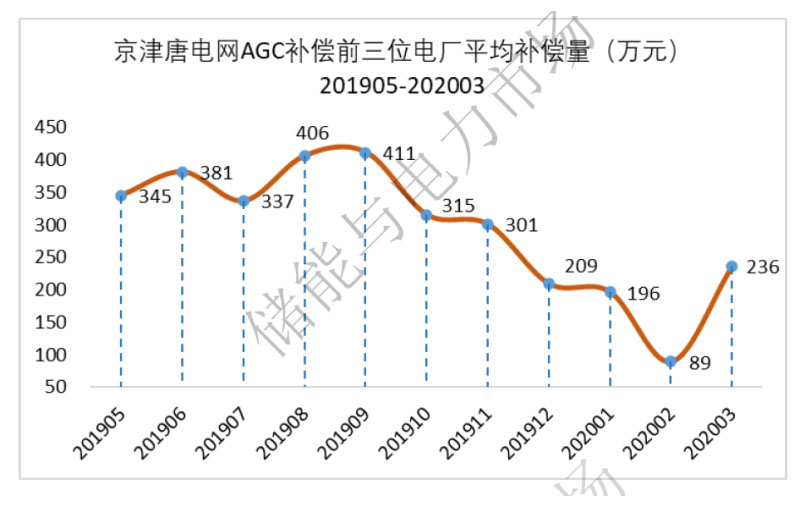 選取京津唐電網(wǎng)2019年5月-2020年3月間,各月補償量排名前三的電廠,取三者月度補償量的平均值。與京津唐電網(wǎng)AGC總補償量趨勢相似,各個電廠獲得的補償量也呈下降趨勢。2020年,最低2月份只有89萬,1月和3月在200萬左右。