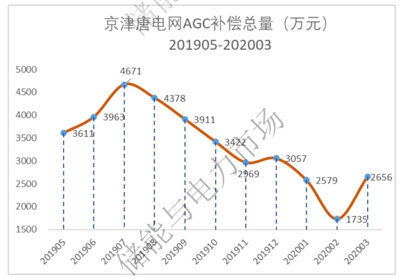2019年5月-2020年3月京津唐調(diào)頻輔助服務(wù)市場的總補償情況如下圖所示。京津唐調(diào)頻輔助服務(wù)的總補償量(萬元)整體呈下降趨勢。2019年7月達(dá)到最近的補償高峰,4671萬元,2020年2月補償量最小,1735萬元。