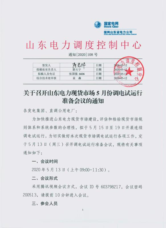 5月12日,山東電力調(diào)度控制中心發(fā)布了《關(guān)于召開山東電力現(xiàn)貨市場(chǎng)5月份調(diào)電試運(yùn)行準(zhǔn)備會(huì)議的通知》(以下簡(jiǎn)稱《通知》)?!锻ㄖ贩Q為加快推進(jìn)山東電力現(xiàn)貨市場(chǎng)建設(shè),評(píng)估和檢驗(yàn)現(xiàn)貨市場(chǎng)規(guī)則體系和參數(shù)的合理性,擬于5月15日至19日開展連續(xù)調(diào)電試運(yùn)行。