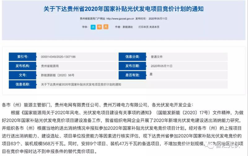 5月11日,貴州省能源局發(fā)布《關(guān)于下達(dá)貴州省2020年國家補(bǔ)貼光伏發(fā)電項(xiàng)目競價計劃的通知》,提出: