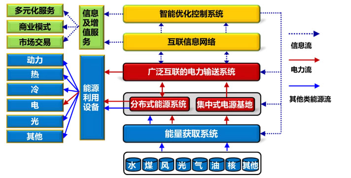 以智能電網(wǎng)為核心、具有廣泛互聯(lián)和智能化特征的能源輸送網(wǎng)絡將構(gòu)成骨干網(wǎng)架,實現(xiàn)以電為中心的大范圍余缺互濟、經(jīng)濟高效配置和系統(tǒng)級安全保障;以多種能源分散、梯級利用為特征的分布式能源系統(tǒng)將構(gòu)成末端節(jié)點,實現(xiàn)能源的集約高效利用。