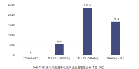 從電池系統能量密度分布來看,2020年4月,我國純電動乘用車系統能量密度在125(含)-140Wh/kg車型產量占純電動乘用車總產量比例12.0%,較3月份提升4.5個百分點,140(含)-160Wh/kg和160Wh/kg及以上車型產量占比分別為51.5%和36.5%。