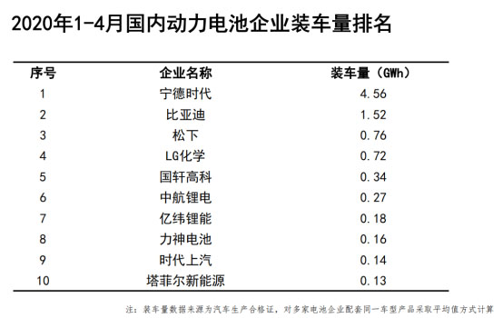 此外,2020年1-4月,我國動力電池裝車量排名前十的企業(yè)分別是寧德時代、比亞迪、松下、LG化學、國軒高科、中航鋰電、億緯鋰能、力神電池、時代上汽、塔菲爾新能源。